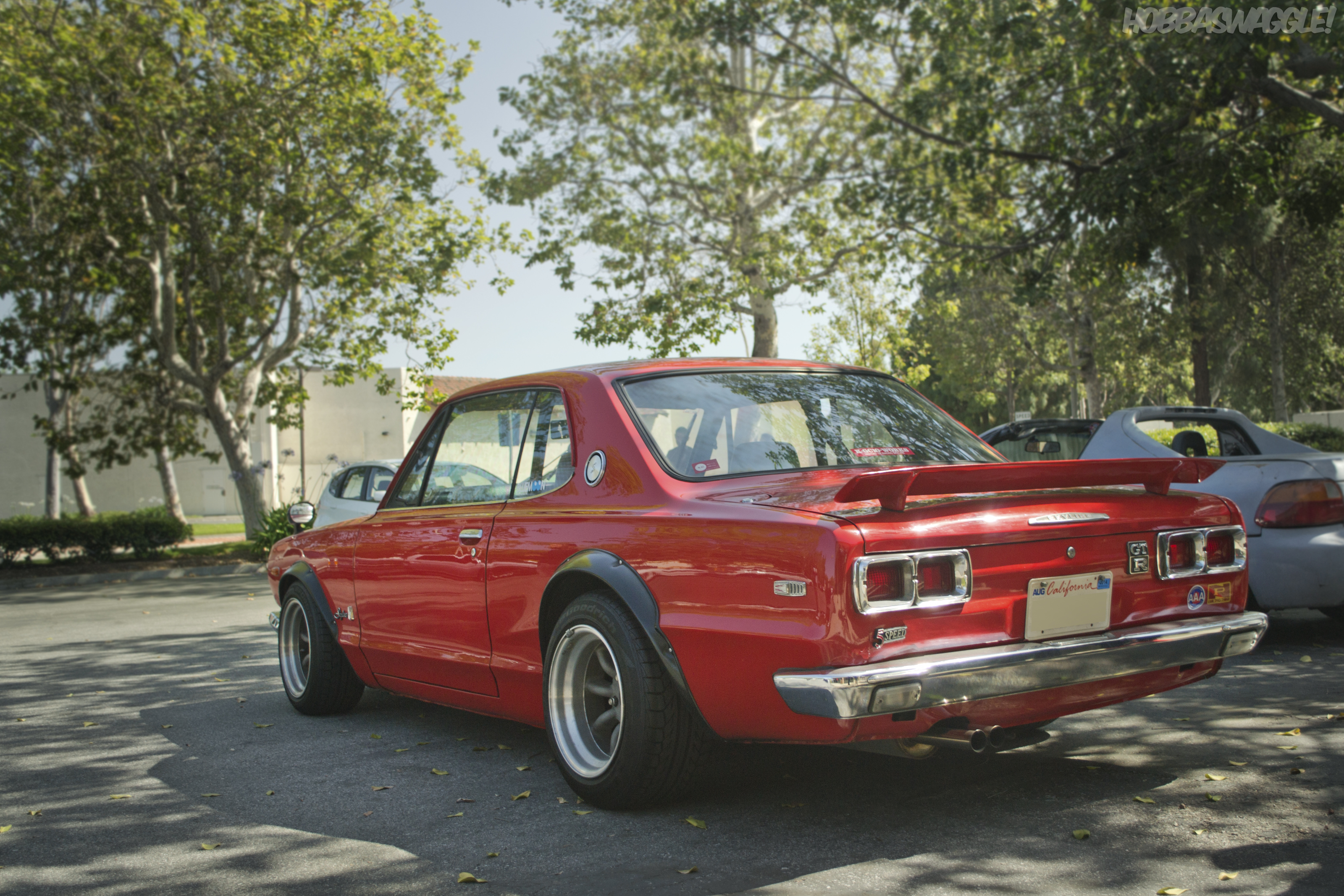 I parked, got all my camera gear situated, and right as I started scanning the lot for where to begin, this gorgeous C10 Hakosuka Skyline parked right in front of me. Now I don’t hold any beliefs regarding the divine, but this was one of those times where I felt like the car gods were smiling over me. Talk about your archetypal setup with a tasteful drop, chin spoiler, and bolt-on overfenders outlining a set of classic Watanabes.
